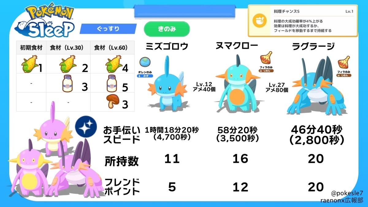 【ポケモンスリープ】ミズゴロウ/ヌマクロー/ラグラージ性能まとめ|食材|出現場所|厳選おすすめ理想個体【色違い比較】